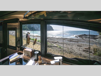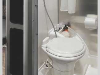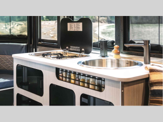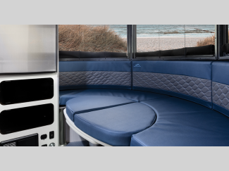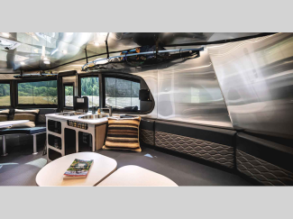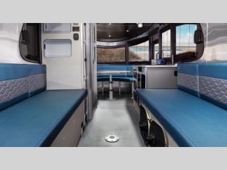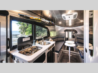 Each is built with a riveted aluminum superstructure, an aerodynamic body and roof profile to help increase fuel efficiency, panoramic front windows to see the outside while inside, and an enclosed, aluminum insulated heated underbelly for better protection against the elements. The interior offers a wet bath, kitchen amenities, handcrafted marine-grade Lite-Ply laminated interior cabinetry, seamless vinyl flooring for easy care, and comfortable sleeping accommodations.
