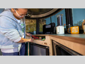 If you desire to leave a lighter eco-footprint, then the REI Special Edition Basecamp is for you. There are recycled materials, a recirculating water heater to save water, plus off-grid features, like the optional solar package. The included X-Package includes a 3" lift kit, off-road tires, and more that will allow you to maneuver tougher terrain, and the ample storage throughout means you don't have to leave behind your favorite comforts from home. You'll also find a functional galley, a nature-minded interior decor, and a versatile rear living space with seating for five and sleeping for two.