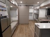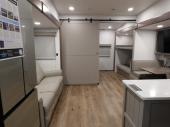 If you've been searching for a fifth wheel with more sleeping space, this is the one! You will find a queen bed in the front private bedroom, along with a wardrobe with washer and dryer prep and overhead storage for your things. Your guests can take the rear bunkhouse that includes 40" x 72" bunks across from a slide out with a flip-up bunk and cube sofa below. Everyone can meet in the middle living area and kitchen to relax on the sofa that is in direct view of the 50" Class HDTV. There is also a booth dinette table here to dine together. If the weather is nice, you may just find yourselves outdoors since there are two awnings and an exterior griddle!
