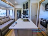 This spacious toy hauler will be perfect for a larger group since there are triple slides, creating more space, plus a bath and a half for added convenience! The full dual entry bath is found in the shared space up front with the master bedroom, and the half bath is in the garage, so you can easily get back outside where the fun is! There are also 60" sofas in the garage, along with a HappiJac queen bed, plus washer and dryer prep if you plan to add these appliances. Your crew will love to spend time in the combined kitchen and living area with its dual opposing slides, spacious sofa, kitchen island, and 40" HDTV with a fireplace!