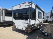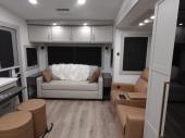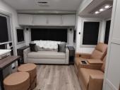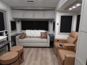 You'll love every minute spent in this luxury fifth wheel! Your crew can get comfortable in the rear living room on the 72" tri-fold sofa that converts to a 62" x 70" bed, or on the theater seating within the slide out. There is also a sliding dining table and a TV with swivel so everyone can have a good view of the movie. A full kitchen, complete with a cooktop, 30" residential microwave, and 16 cu. ft. refrigerator will let you cook and store food, and there is a handy trash bin with a Stow N' Go paper towel holder for easy clean up. The full bath will let you freshen up before heading to bed in the front private bedroom!