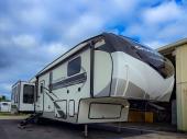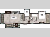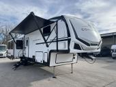 What could be better than a camping trip with family and friends? A camping trip in this spacious fifth wheel that can sleep eight people comfortably! There is a private middle bunkhouse with double-size bunks and overhead cabinets to store belongings, and a front private bedroom with a queen bed slide out. You'll find storage space in the large bedroom wardrobe that also includes washer and dryer prep if you plan to go full-time or camp for longer periods of time. Everyone can meet in the main living area that includes dual opposing slides, theatre seating, a free-spanning table, plus a tri-fold hide-a-bed sofa! And we didn't even mention the fully-equipped kitchen with stainless steel appliances, an extra deep single basin sink, plus tons of counter space with overhead cabinets for more storage!