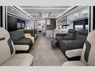 Ride high with the air ride suspension and air brakes, and set up easy with the fully automatic leveling jacks. There are practical innovations like the true flat floor bedroom design to eliminate climbing over the engine cover to get into bed, the side opening huge pass-through storage area on the outside for easy access to your supplies, and the smart design of the interior storage so you can bring what you want. You can gaze out at your beautiful sceneries every where you go with the frameless tinted windows that provide a panoramic view!