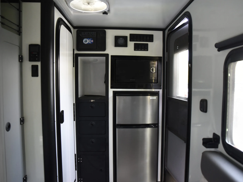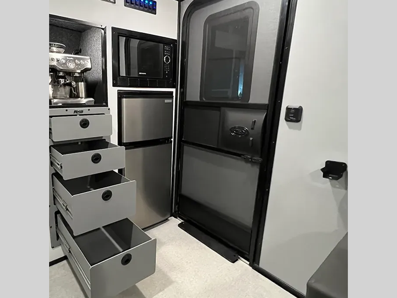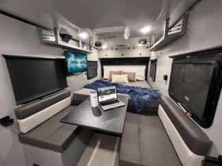 You won't find wood in any of the ROG's construction. Instead, Encore RV has opted to use aluminum and fiberglass to create a lightweight product that won't rust or corrode. You also won't find any wood in the kitchen cabinets because these are made of aluminum too, and there are solid surface countertops that are easy to keep clean.