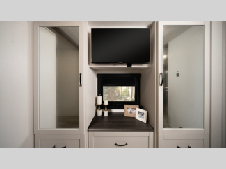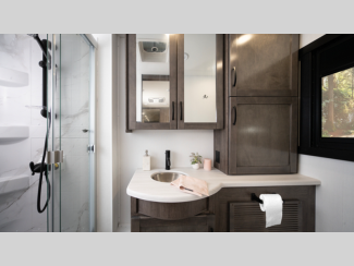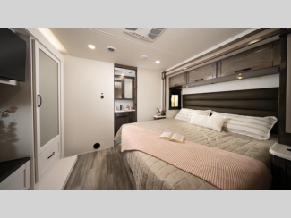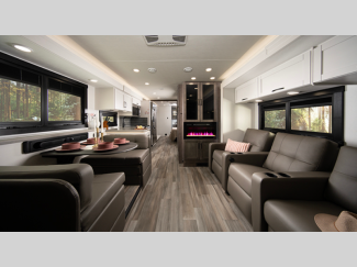 The E-Z Drive Elite comes with a computer balanced driveshaft, heavy-duty front and rear stabilizer bars, Koni shocks, and more so you can be sure to safely arrive at each destination. A Ford F53 chassis and TuffShell vacuum-bond laminated floors and sidewalls hold them together, and the new fiberglass color with updated graphics is sure to be eye catching. Inside, you'll enjoy LED-lit solid surface countertops, a residential refrigerator, hardwood cabinet doors and drawer fronts, and more luxury features to make you feel right at home.