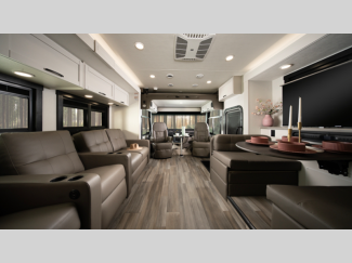 - E-Z Drive™ Elite; 15,000 BTU A/C unit with heat pump and second 13,500 BTU A/C unit; Exterior entertainment center; Electric patio awning with LED lights; Slideout cover awnings; Onan® 5,500W generator; 1,200W inverter; 50-amp electrical service; 10 gal. gas/electric water heater; Sony® infotainment center; Backup and side-view cameras; Removable driver/passenger cockpit table; LED-lit solid-surface countertops, LED HD Smart TV in living area; Integrated day/night cassette shades