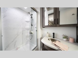 - Shower with decorative surround, glass door, skylight and light