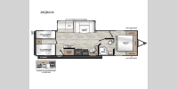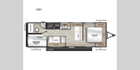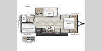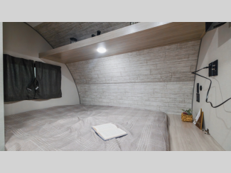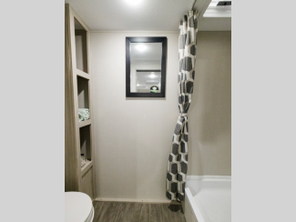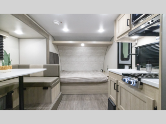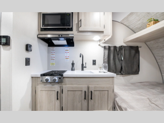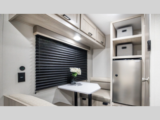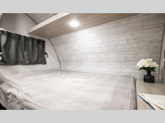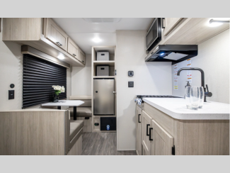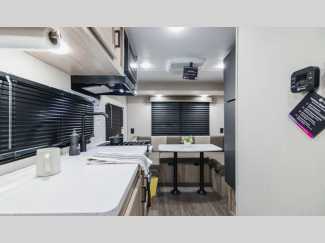 A seamless roof membrane, full length frame E-coated outriggers, and 2' x 3' floor joists on approximately 12" centers with horizontal support studs hold these units together. The water heater by-pass winterization kit gives you the ability to camp all year round, and you will love the smooth aluminum radius front for a sleek look. Inside, you'll enjoy black nightshades in the living room, GE kitchen appliances, and many more comforts!