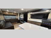 This travel trailer will feel just like home with its RV king bed in the front bedroom plus the full bath with a tub/shower, and there is a spacious living area thanks to the large slide out. Here, you'll find the air fryer and counter space, 12V refrigerator, and the fireplace with a hidden pantry behind it. Your crew can relax on the L-shaped sofa, or visit with the chef while they prep meals at the island peninsula. There are even two bar stools here for added convenience. Head outdoors to enjoy the power awning with LED lights in the evening!