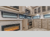 The perfect couple's fifth wheel offers privacy in a front bedroom with a queen bed, a slide out wardrobe providing more floor space, and more storage for your things. You will also appreciate the second entry into the bathroom from the bedroom, and the linen storage in the bathroom and the radius shower that saves floor space. The cook will love all the counterspace and cabinets provided in the rear kitchen and along the side wall, plus the ceiling fan can keep the air circulating when the air conditioner is off. The large king U-shaped dinette allows you to play games, dine, and even work with lots of seating and table space for many to gather when you invite guests over.