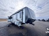 You will love the rear living area with a full wall entertainment center including a fireplace, a ceiling fan, and dual opposing hide-a-bed sofas, plus theater seats! The middle kitchen area gives the cook full amenities including an 18 cu. ft. refrigerator, and a unique dinette with bench seating and two chairs. You can even relax outside under the two awnings, and you will find a pass-through compartment and more exterior storage included in the front for all your outdoor gear. When you are ready for bedtime, get cleaned up in the full bathroom and you can even take a seat while showering, and the front master gives you a queen bed slide, a dresser, and a full wall wardrobe plus shelves within the cabinet.