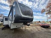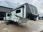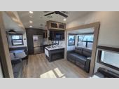 This fifth wheel has everything and then some! The front private bedroom has a queen bed slide with an optional king bed that can replace it and a front wardrobe with washer and dryer prep. Freshen up each morning in the full bathroom featuring a shower with a seat then head to the rear kitchen and scramble up some eggs on the three burner cooktop. You can enjoy your morning coffee and eggs at the table and chairs with a bench. In the middle living area there is a 60" theater seat across from an entertainment center with a fireplace and opposing hide-a-bed sofa slides. Outside, you'll find two power awnings, multiple exterior storage compartments and a pass-thru storage for fishing poles, camp gear and more!