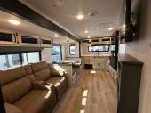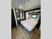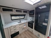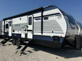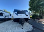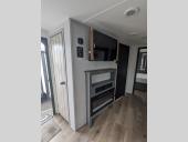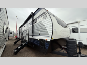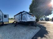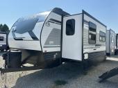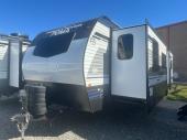 Walk into this travel trailer with one of the dual entry doors for a great camping trip! One entrance enters directly into the rear private bedroom which has a queen bed slide, a walk-in closet with washer and dryer prep, a wardrobe, and even an entrance into the dual entry bathroom. Grab a snack from the walk-in pantry then relax on the sofa while you watch a movie with the entertainment center or play a game at the booth dinette. The front kitchen has everything you will need to prepare your best home cooked meals including lots of countertop space, a stainless-steel oven and range, and a stainless-steel microwave!