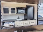 The kids will love having their own rear private bunkhouse in this travel trailer! Inside the bunkhouse is a 38" x 76" bunk above an entertainment center, a closet, and a 32" x 69" bunk above a jiffy sofa slide. The full bathroom with a 34" x 34" radius shower is just outside the bunkhouse for them to easily access it at night. They can even invite a friend or two to tag along and sleep on the sofa and U-shaped dinette once converted. Behind the entertainment center is a closet/pantry to keep your favorite snacks and the kitchen has a 12V refrigerator to keep your beverages cold. When you're ready to wind down your nights, head to the front private bedroom and relax on the queen bed with shirt closets and nightstands on either side of it, plus it has one of the dual entry doors to the unit! This model also has an outside kitchen option if you enjoy cooking in the fresh outdoors!