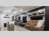 You're going to feel right at home in this travel trailer! The front private bedroom has a queen bed slide for a good night's rest, a dresser and front closet for your clothes, and another closet with washer and dryer prep. Freshen up each morning in the full bathroom with the 32" x 40" shower with a seat and then head to the kitchen to fry up some eggs on the stainless-steel oven and range. You will also appreciate having a kitchen island for easier meal prep and a walk-in pantry to easily see your canned goods and snacks. The booth dinette offers a comfortable place to dine, play, and even sleep once converted. What better way to wind down your nights than to relax on either the rear sofa or on the theater seating across from the entertainment center with a fireplace!