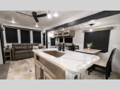 Get ready to enjoy your destination for a weekend or even longer in comfort with the front living and kitchen combined area. The sofa, table and chairs plus theater seating offer a place to relax, dine, and let guests sleep over. There is a kitchen island to prepare and serve meals from and wash the dishes. The kitchen offers full amenities including a residential-style refrigerator and plenty of storage. You will surely enjoy the natural lighting from the patio door, and the second entry/exit is located in the rear private bedroom where you can sleep like royalty on the king bed. There is also a closet with washer and dryer prep if you choose to add these appliances.