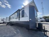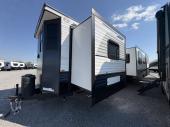 Your guests or older children will love camping in this spacious destination trailer thanks to the private bunkhouse suite with dual opposing slides with a jiffy sofa and bunk within each slide, plus a full rear bath! You'll find your own space up front in the master bedroom, complete with a 72" x 74" queen bed slide, a dresser, additional storage, a countertop, and even washer and dryer prep. The walk-thru bath will let you easily get to the combined kitchen and living area that features a large slide out with a sofa and free-standing table, across from an entertainment center with a fireplace. Outside, you'll find a spacious 21' awning and outside storage for hiking gear, fishing poles and more!