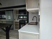 With any Wildwood Heritage Glen fifth wheel by Forest River, the quality construction, attention to detail and design along with a bright and welcoming interior allows you to relax in comfort. You'll love the high-end solid surface countertops included in the Elevated Value Package, along with a JBL sound system, full-length barreled ceilings, and an ultimate interior lighting upgrade. The included Expedition Package features an Accesibelly underbelly panel with 12V tank heaters, nitrogen-filled tires with aluminum rims, and a spacious 30" wide main entry door with a window. The Lippert On-The-Go ladder prep and back-up camera prep let you customize your fifth wheel even more, and the LED awning, front cap, marker and taillights will make it easier than ever to set up camp!