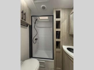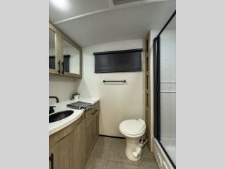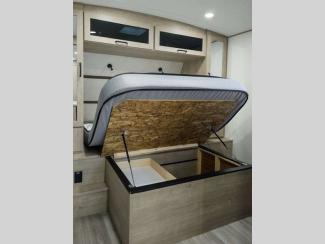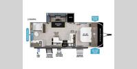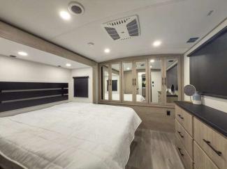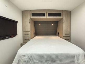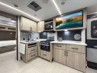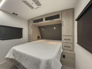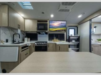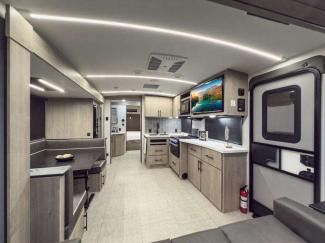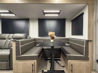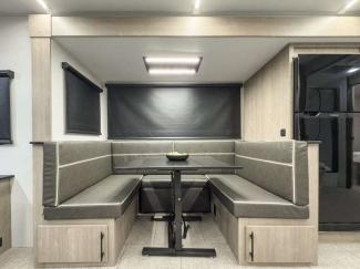 Each of these includes exceptional features, like a 200W roof-mounted solar panel, high-capacity furnace, residential cabinetry, spare tire & carrier, and a universal docking station. Additionally, you'll have accommodating features scattered all throughout the trailer with the upgraded residential furniture in the interior, the solid surface countertops in the kitchen, motion sensor entry LED lighting, and the large panoramic windows in the interior. The aluminum framed fully laminated sidewalls and enclosed underbelly with suspended tanks will hold them up for your adventures on the road!