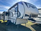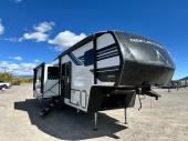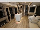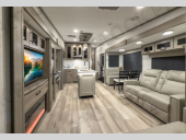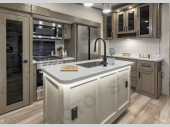 Whether you travel for pleasure or work, you will love the spacious main living and kitchen area with a rear tri-fold sofa that doubles as extra sleeping space, and the theater seating directly across from the entertainment center with a 40" LED HDTV and a fireplace below. The kitchen island will make meal prepping and drying the dishes easier and the hutch is the perfect place to place your picture frames, nice dishes, and extra cooking items. There is even a pantry that is big enough to store all of your favorite snacks, dry ingredients and such. Outside you can enjoy two electric awnings that provide protection from the elements as you relax and visit with other RVers, and your camping chairs can easily be stored in the pass-through compartment. The double entry bathroom is convenient especially at night when you can slide the door to enter from the front master bedroom. You will find plenty of storage for your clothing and gear, plus the bedroom slide out gives you drawers and linen storage that stretches into the full bathroom.