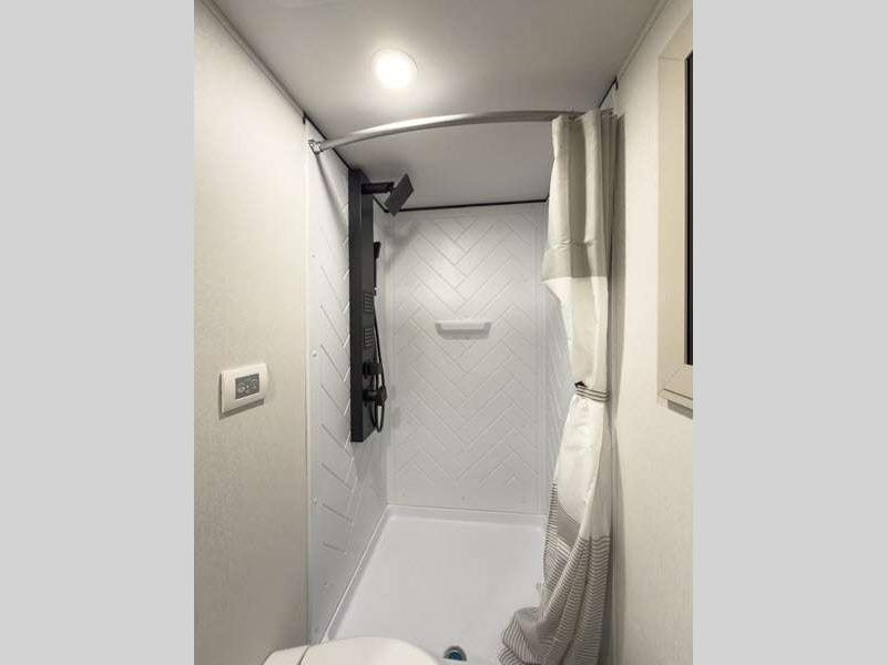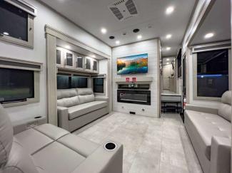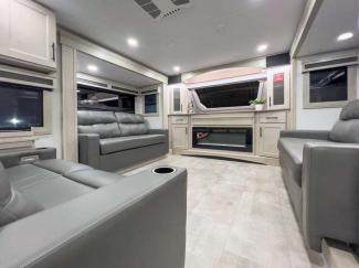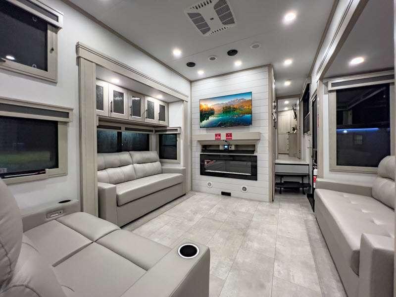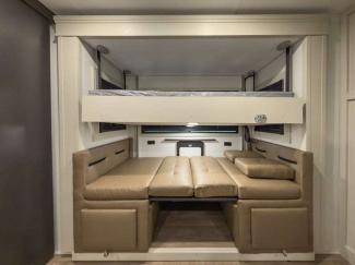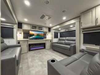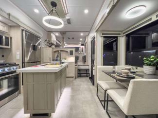 Each is built on a 101" wide body drop-frame super chassis, and includes the MORryde pin box system that utilizes a unique rubber shear spring to positively deal with rough towing and road shock. Some standard features that stand out include the chef-inspired professional grade stainless steel cooktop and Smart sink with a removeable cutting board, produce strainer and glass rinser, and the on-demand water heater with a whole house water filtration system. There is also an all-in-one enclosed and heated utility center to enjoy four seasons of camping, plus many more comforts.