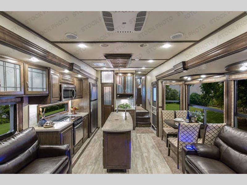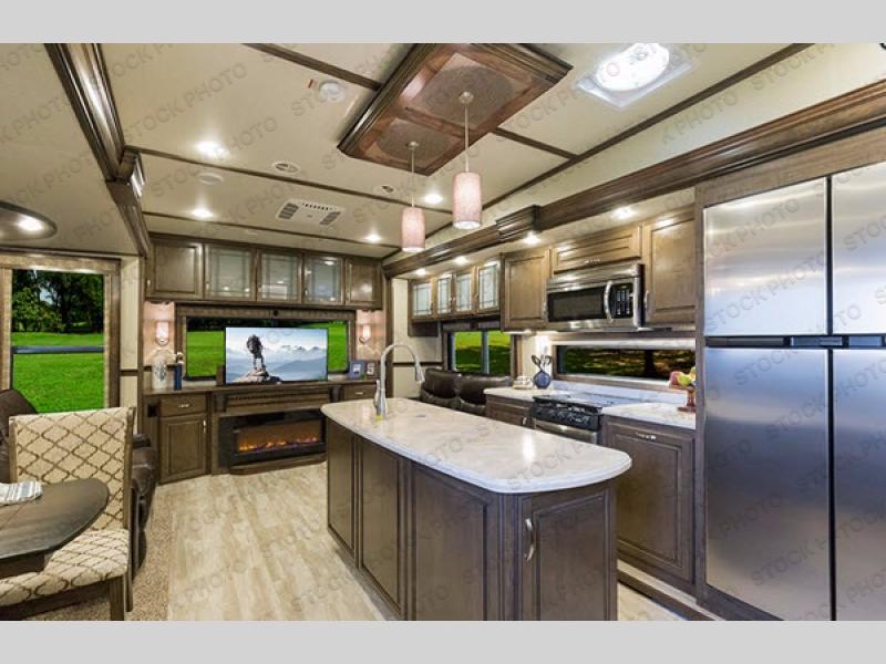 Along the rear of this unit find a full wall entertainment center with a LED TV and fireplace. There is also overhead storage as well. The tri-fold sofa adjacent which is part of the kitchen slide offers a great conversation area that is perfect for entertaining family or friends.