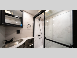 - Core Shield aluminum-framed and vacuum-bonded laminated gel-coated fiberglass exterior walls and slide room end walls
