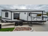 Take your off-road toys and the family to the best camping areas with this toy hauler! The 15' garage has a power queen bed above a sofa with a dinette and two recliners for a relaxing evening. Keep your perishables fresh in the 10.7 cu. ft. refrigerator, fry some bacon on the three burner cooktop, and easily clean up with the deep basin undermount sink. The dual entry bathroom has a shower with a skylight above to bring the outdoors inside, and leads directly into the front master suite which has a king bed slide to enjoy a good night's rest. You could even enjoy a cold beverage from the outdoor refrigerator while you cook at the outdoor griddle!