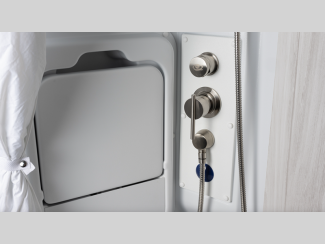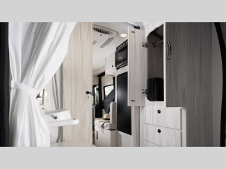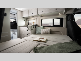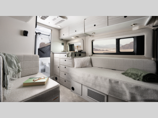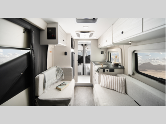 Some of the stand out features you'll enjoy with this camper van are the Aqua-Hot hydronic water and heating system, the ParkView rear backup camera, and the collision mitigation with active braking. You will love having a Thule awning with LED lights outside, along with an outside shower, sliding vented windows, and two 120V outlets. A 2,800W gas generator and 1,000W inverter also comes standard to keep you powered up, and you're sure to enjoy the residential vinyl flooring inside, along with pressed countertops and a convenient wet bath.