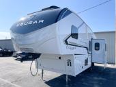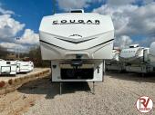 The Cougar Sport structural I-beam frame with stamped steel cross-members and outriggers, plus its AlphaPly roof membrane are what active RVers love about the construction of the Cougar line. The Cougar Sport models are no exception when it comes to a great package, as well as being smaller and lighter weight than their big brother Cougar models. A one-piece, heated and enclosed polypropylene underbelly will add protection against the elements, and the electric stabilizer jacks will provide more stability. On the inside, residential shaker style hardwood cabinet doors and decorative crown molding, plus seamless pressed countertops and an on-demand water heater will make your unit feel even more like home. You are also sure to appreciate the shiplap style decorative accent wall behind the bed, a porcelain foot flush toilet in the bathroom, plus residential kitchen hardware, and so much more.