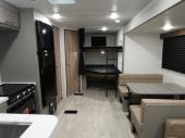 Pack your bags and head for the lake or woods in this spacious trailer! You can comfortably sleep nine to ten with the double-size bunks and the queen bed in the front private bedroom, plus the booth dinette and sofa in the main living area. There is even TV prep here if you want to add a television to the entertainment center for movie nights. The kitchen includes a 10 cu. ft. 12V refrigerator and an extra large pantry for food storage, plus a cooktop to prepare meals each day. The full bath included will let you clean up after a day of exploring outdoors, and you'll find the second entry door here for convenience!