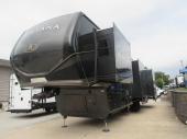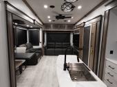 This fifth wheel has everything you need! The front private bedroom has a king bed slide across from a Smart HDTV with a dresser below it, plus two closets and additional storage. Freshen up each morning in the full bathroom with the 48" x 30" fiberglass shower with a seat and skylight above for more natural lighting as you get ready. The kitchen has everything you need to prepare your best meals including extra countertop space on the kitchen island. Enjoy your meals at the dinette with storage and then relax on the rear hide-a-bed sofa or the power theater seating across from the entertainment center with a 50" Smart TV to watch your favorite movies!
