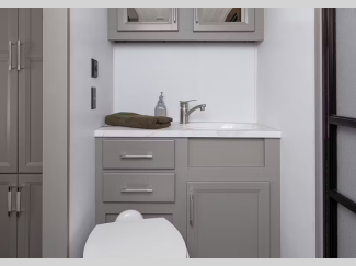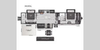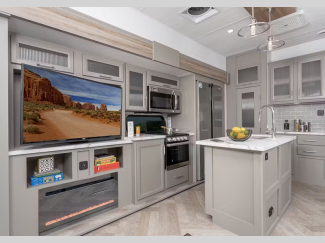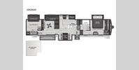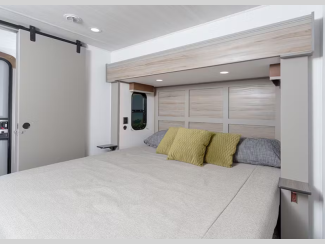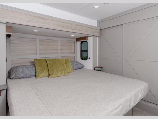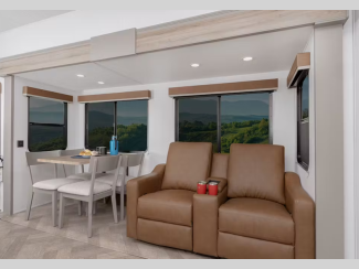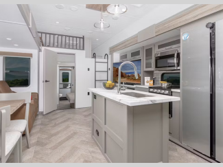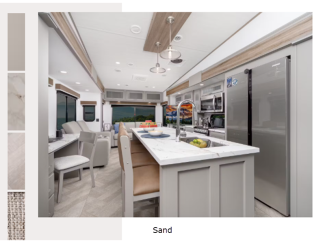 You will find residential style seamless marbled countertops, Dyna Span marine grade decking, residential style screwed and glued cabinetry, and designer upholstered window valances to make you feel right at home. The MaxTurn technology with Road Armor will make for smooth towing and the automotive-grade painted fiberglass front cap includes KeyShield protection for added convenience.
