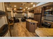 You will love living in this RV, be it full-time or months at a time! From all the home touches such as a ceiling fan, a kitchen island, and two swivel-rocker recliners to the full bathroom with a seat in the shower, and triple slides, this fifth wheel is spacious and inviting. When you decide to relax inside, you can watch the 40" LED Smart TV in the living area or add the optional 32" LED Smart TV in the bedroom. Enjoy many days and evenings relaxing under the awning while you visit with other RVers, and when you are ready to retire for the evening, the front bedroom offers a walk-around king bed slide out.