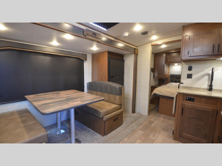 You will be able to camp all year long in all climates thanks to the triple layered four seasons roof insulation, the XL furnace, and the unique heated and insulated holding tank design. The rugged 2" bonded aluminum frame walls and custom built off road chassis will provide durability, and you'll appreciate the rugged Goodyear E range tires when heading up to the mountains. Each model includes ultra leather furniture inside, as well as residential height countertops, XL panoramic slide out windows, and a mountain comfort mattress.