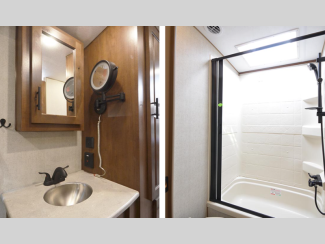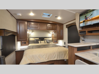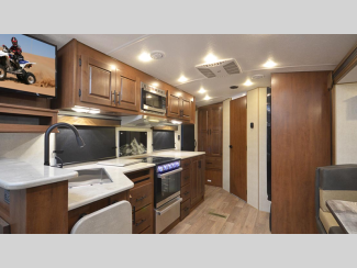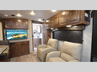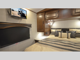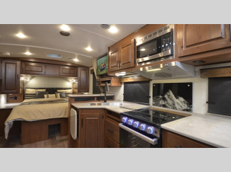 These models are designed with a rugged 8" chassis with XL ground clearance and 5,100 lb. axles for camping trips across the nation. You will appreciate the 10 gallon water heater, the XL refrigerator, plus the 15,000 A/C to keep you comfortable during the summer months. The mountain lodge interiors will have you feeling like you're staying at a lodge in the forest, and the LG solid surface countertops will add that touch of luxury.