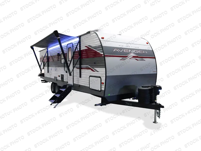 With any Avenger travel trailer by Prime Time, the exterior includes an aerodynamic smooth front metal, a diamond plate front rock guard for protection on the road, and four stabilizer jacks to keep your unit secure. There is a fully walkable roof plus an enclosed and heated underbelly that will help extend your camping season. The interior offers a 15,000 BTU air conditioner for the perfect climate inside, in-floor ducted heat, a systems monitor panel, and a Winegard 360+ antenna with Wi-Fi prep that will give you the option to stay connected as you camp. Each model also includes seamless Carefree Congoleum flooring, kitchen backsplash, shower pans in all models, and pleated nightshades throughout to name a few interior comforts!