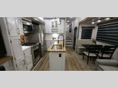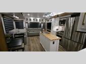 This fifth wheel is one your whole crew will love thanks to the middle bunkroom with a "Sleep & Play" sofa, an upper bunk, a dresser for storage, plus a loft above this room! You will enjoy the front private bedroom all to yourselves with a king bed slide out, a large wardrobe with washer and dryer prep, plus a dresser for more storage. When you're not outdoors relaxing under the 19' electric awning with LED lights, head to the rear living area to sit back on the theater seating or the EZ glide sofa. You'll also find an LED Smart TV here and a booth dinette for game night, or you can choose the free-standing chairs option. The chef will love the outside kitchen just as much as the indoor kitchen with an island, two pantries, and a 16 cu. ft. French door refrigerator!