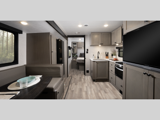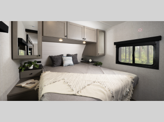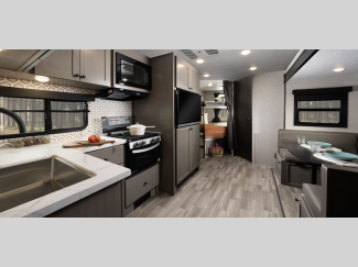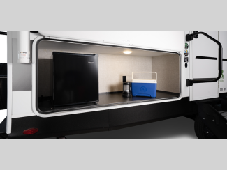 Each is built with a PVC roofing membrane that is low maintenance, flexible, puncture resistant and recyclable, and Thermal Seal that includes an enclosed, insulated and heated underbelly plus a fully insulated roof. The mandatory Customer Convenience Package includes a power tongue jack, a 15,000 BTU roof-mounted A/C, pressed membrane countertops, plus many more at-home comforts.