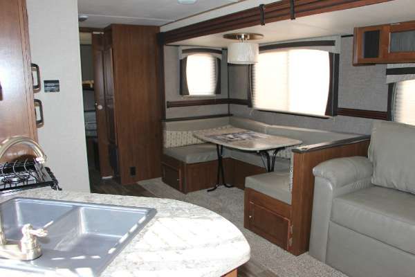 The side opposite features a slide out sofa and u-shaped dinette which provides plenty of seating for everyone during mealtime, playing board games, or just hanging out. A storage pantry is located just off the dinette slide for all of your dry goods and more.