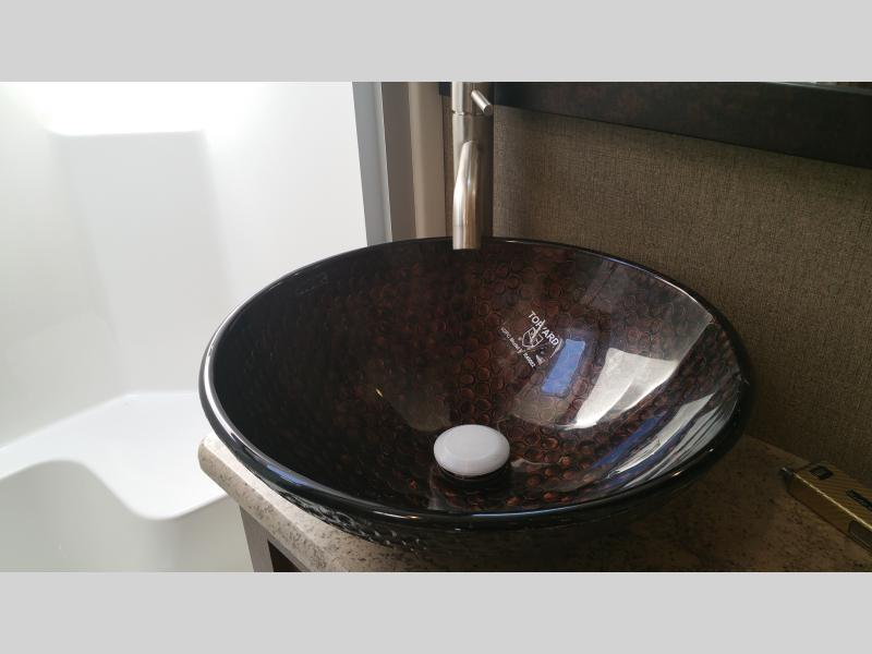 What I liked most: Bedroom has lots of storage with 2 small nightstands on each side with dual storage compartments, a wardrobe closet for all your clothes and shelf on each side for shoes, and a chest of 6 drawers. The shower room has lots of storage 3 drawers, 3 cabinets and a shelf with 3 compartments. The bathroom also has a really cool sink.