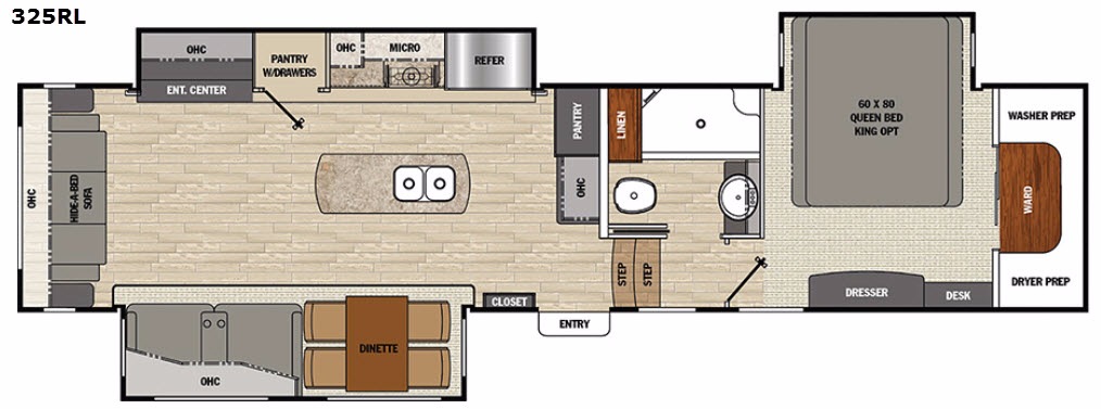 In the very rear of the unit there is a hide-a-bed sofa with end tables and overhead storage the entire width of the fifth wheel. There is an entertainment center in the slide opposite the door side slide adjacent to the sofa. This slide also features the kitchen amenities as well. You will find a pantry space with drawers, a refrigerator, a three burner range with overhead microwave, plus counter space and storage above it.