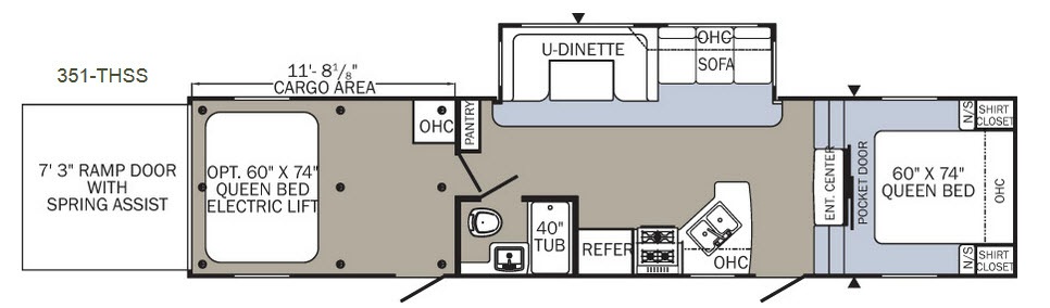 The rear 7'3" spring assist ramp door will make loading and unloading a breeze and the tie down rings will make it easy to keep things secure as you travel. The cargo area has its own side man door so you can easily check on things once the rear ramp is closed. Add the optional electric queen lift bed for added sleeping space if needed.
