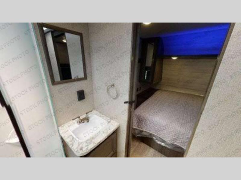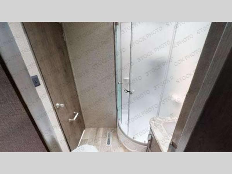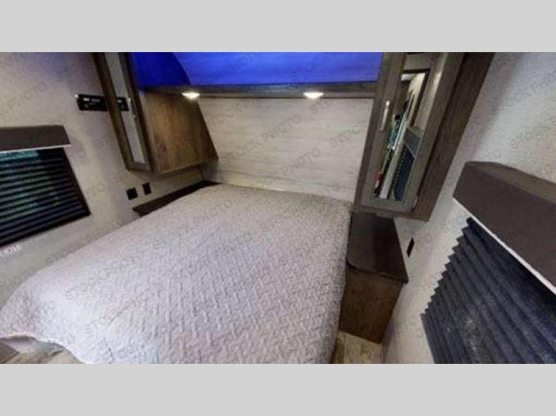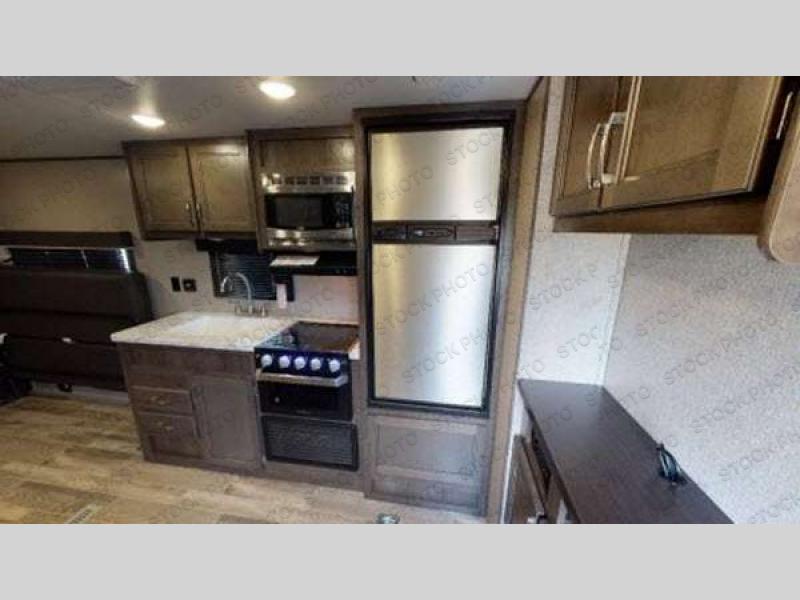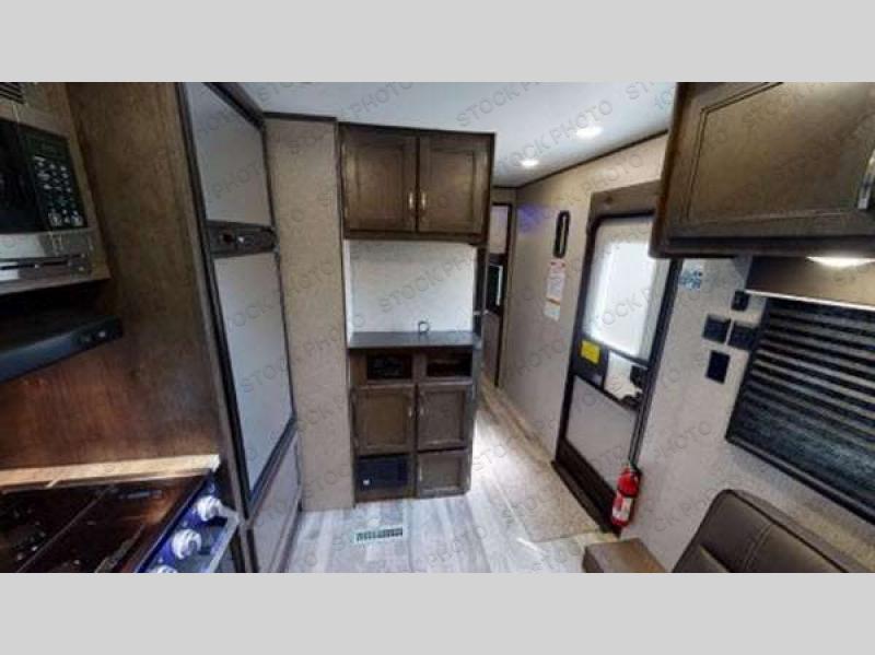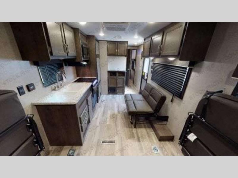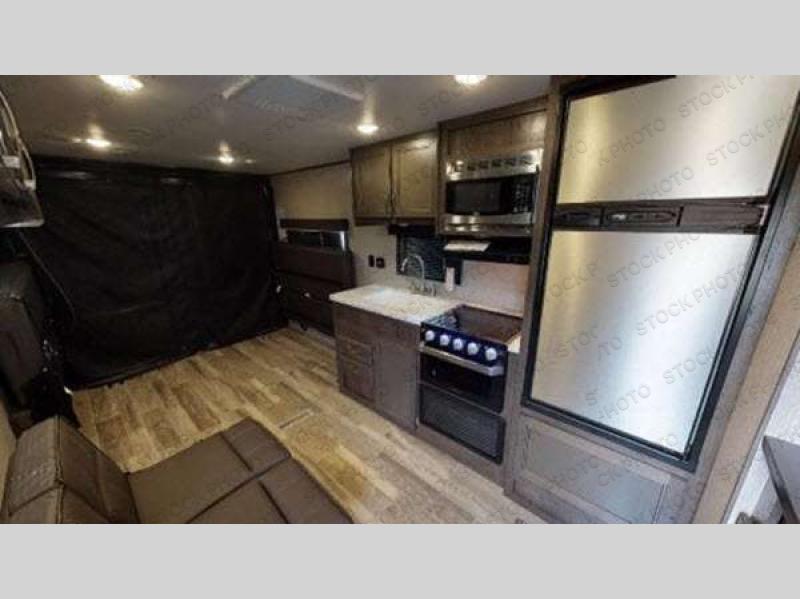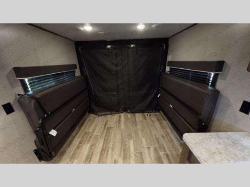 You can load up your favorite off-road toys into this toy hauler and know that they will arrive safely thanks to the D-rings welded to the frame! The whole gang can relax together with the dual convertible sofas with a removable table in between and the fold-up sofa by the entertainment center. The dual entry bathroom makes it easy for everyone to access and take a hot, steamy shower in the radius shower with a skylight above for natural lighting. The front private bedroom features a walk-around queen bed with a bedspread for you to enjoy a good night's rest, wardrobes on either side of it to hang your clothes, and the second entrance into the bathroom. Don't worry about leaving any camping items behind because the pass-through storage area has you covered!