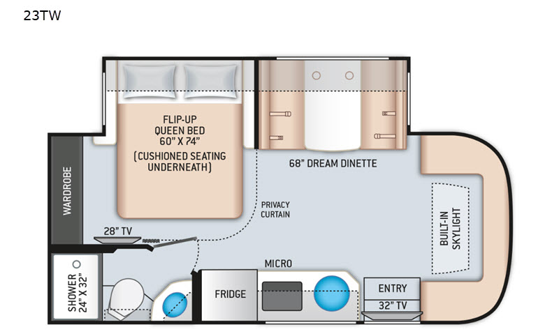 Spend your time enjoying your surroundings instead of worrying about your accommodations with this Compass Class B+ gas motorhome! This compact unit will allow you to have extra interior space once you've parked because of the full-wall slide, and it also allows you to have a cozy private bedroom in the back once you pull the privacy curtain shut. With the 32" TV in the central living area and the 28" TV in the bedroom, you will always have a place to watch your favorite shows.