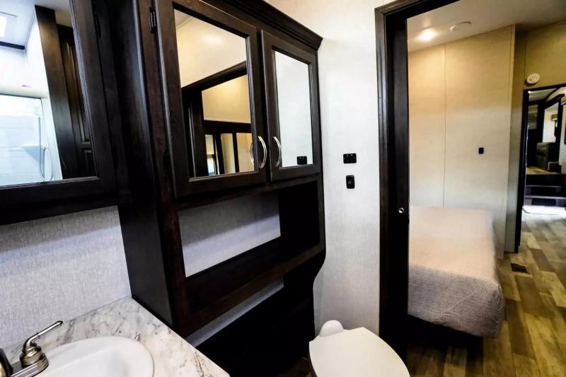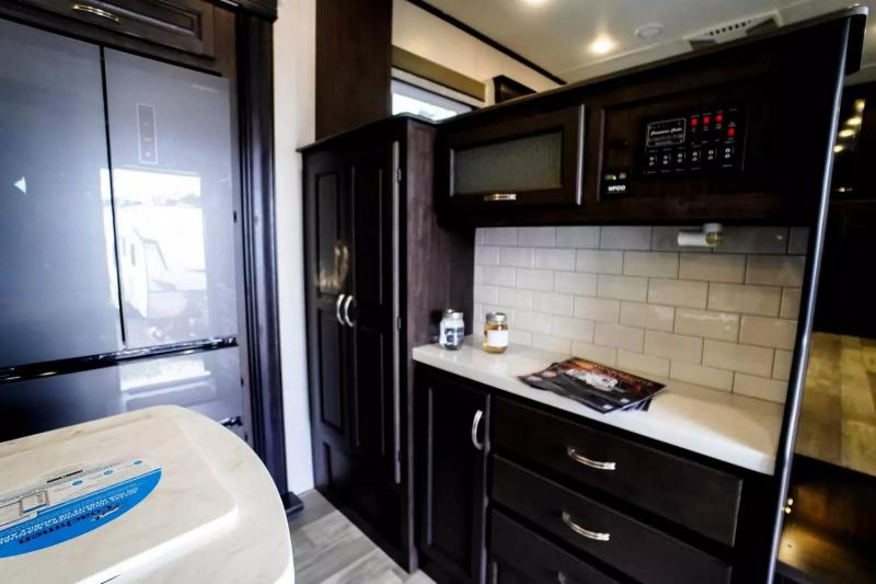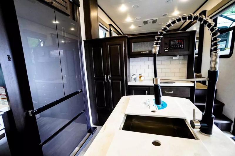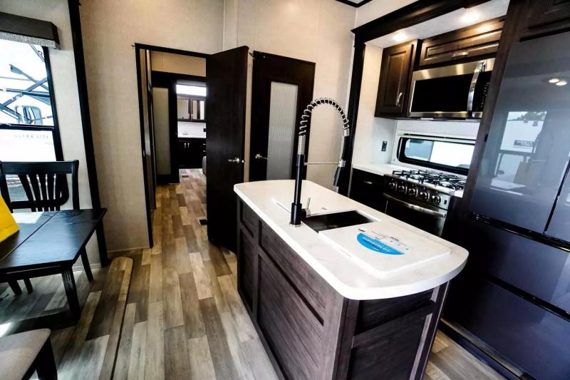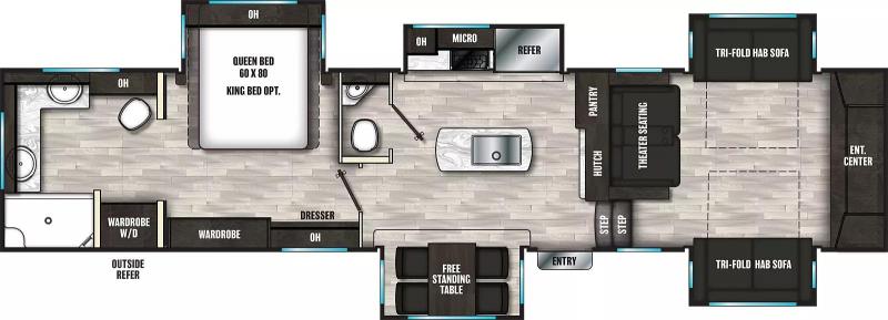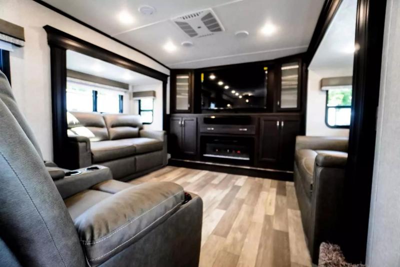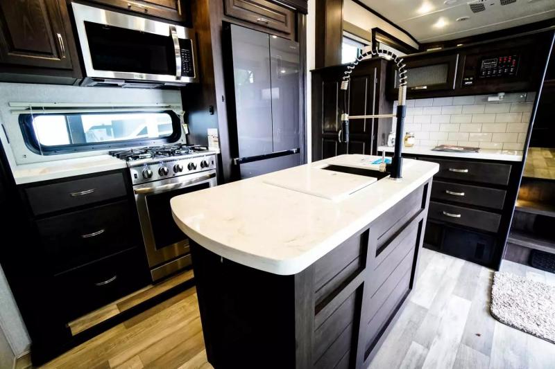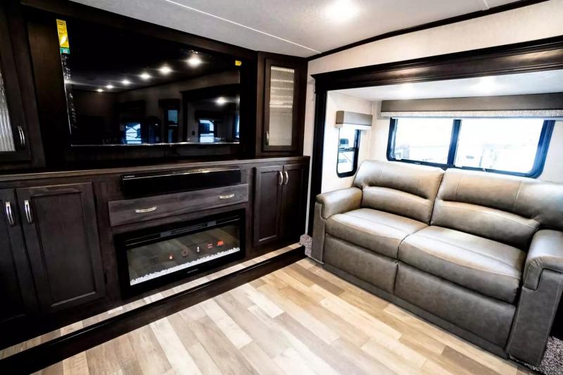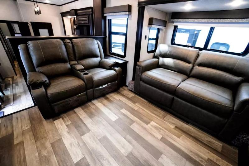 If you're looking for a luxury fifth wheel with more space and a larger sleeping capacity, you've found it! There are an impressive five slides, including dual opposing slides in the front living area and kitchen so you can really stretch out. Everyone will love to gather in the front living area on the two tri-fold sofas and theatre seating, and this room can become your guests' bedroom at night. The little ones will love to play a game at the free-standing table while the chef cooks dinner on the residential cooktop with a stainless steel oven. You'll also find a pantry here for dry goods and a residential refrigerator for perishables. The feature that really stands out in this model is the master suite, take a look! A queen bed slide can be optioned out for a king bed, and you'll have a dresser and a wardrobe for your clothes. The spacious full rear bath includes a large shower with a seat, a large dual sink vanity, and a wardrobe with washer and dryer prep. And we didn't even mention the outside refrigerator that will be perfect for cold drinks under the 14' power awning!