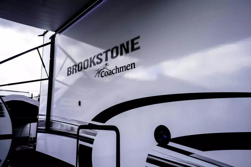 The Brookstone fifth wheels by Coachmen are coming to you with wide-body comfort, home-like amenities, and unique designs for a truly luxurious RV. The 4 Season Protection Package includes double batten insulated roof with radiant barrier insulation, Weather Shield+, a 40,000 BTU high capacity furnace, and more that will help you extend your camping season or go full-time. The frameless automotive-style windows feature 80% privacy tint safety glass, and the vacuum bonded and aluminum framed sidewalls with rot proof Azdel will provide durability. Head inside to find solid hardwood drawers, granite/marble style solid surface countertops in the kitchen, a residential bed with a pillow top mattress and full storage underneath, and the list of comforts goes on! The Brookstone also includes 6-point electric auto-leveling, marine-grade exterior speakers with an LED light, four Solid Step entry steps, and many more exterior conveniences!