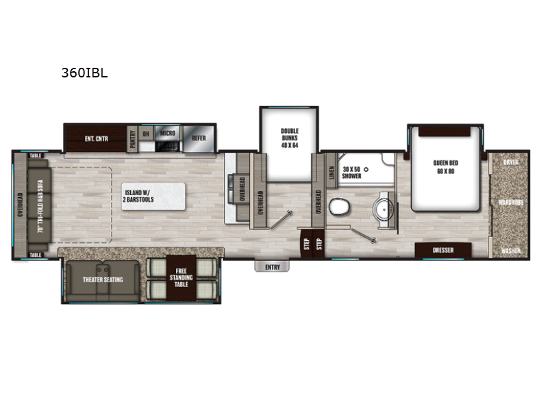 What could be better than a camping trip with family and friends? A camping trip in this spacious fifth wheel that can sleep eight people comfortably! There is a private middle bunkhouse with double-size bunks and overhead cabinets to store belongings, and a front private bedroom with a queen bed slide out. You'll find storage space in the large bedroom wardrobe that also includes washer and dryer prep if you plan to go full-time or camp for longer periods of time. Everyone can meet in the main living area that includes dual opposing slides, theatre seating, a free-standing table, plus a tri-fold hide-a-bed sofa! And we didn't even mention the fully-equipped kitchen with stainless steel appliances, an extra deep farm style sink, plus tons of counter space with overhead cabinets for more storage!