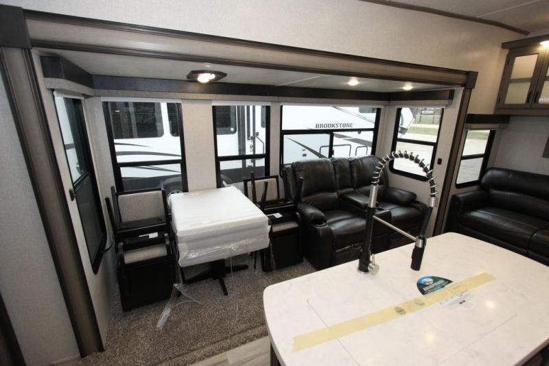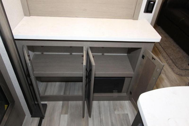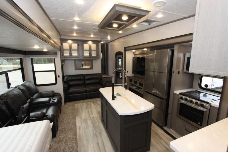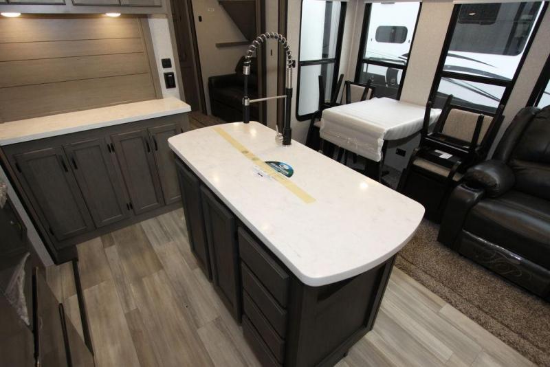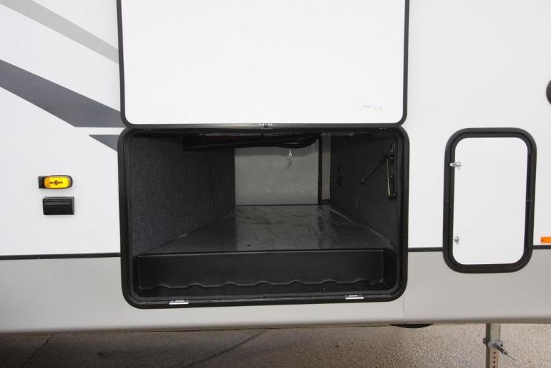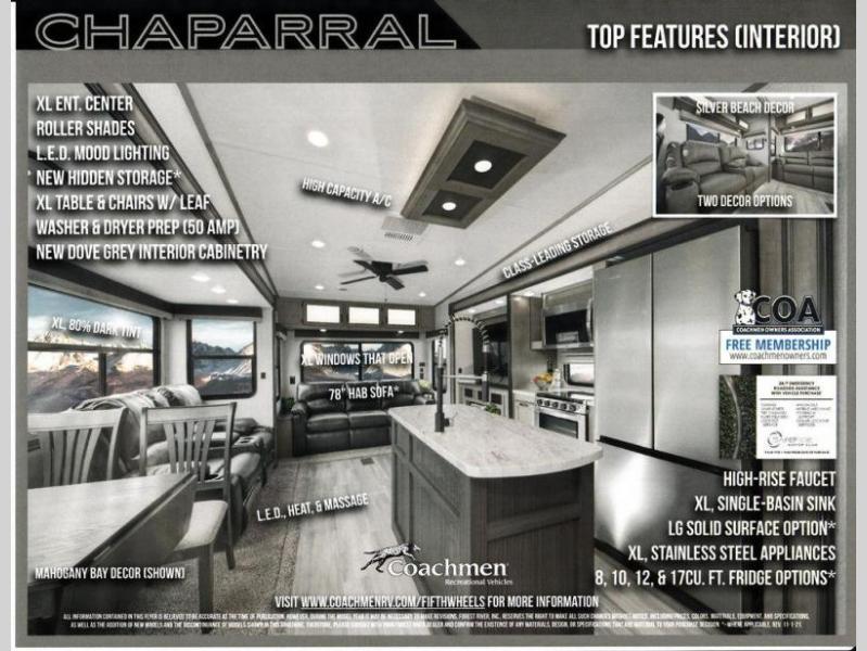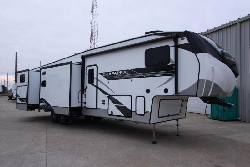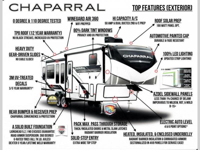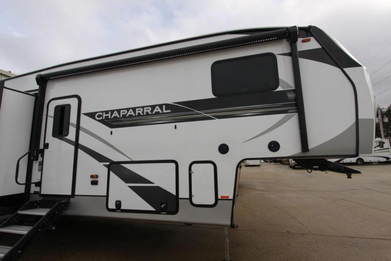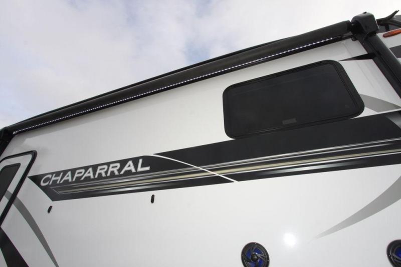 Each Chaparral mid-profile fifth wheel by Coachmen is designed with residential features, loads of storage space, and roomy bedroom suites to make you feel right at home. The durable construction means you can enjoy your RV for years to come. There's vacuum bonded and aluminum framed sidewalls with rot proof Azdel, Weather Shield+ technology that will allow you to camp year around, and a UV and corrosion resistant TPO roof. Each model includes a Winegard Air 360 HDTV/radio dome antenna and an AM/FM/CD/DVD player with Bluetooth to keep your entertained, and the exterior TV hook-up means you can add an exterior TV if you plan to spend more time outdoors. Inside, you'll find durable and seamless Thermofoil, granite/marble style countertops with no T-mold, roller night shades, and dual USB charging ports in the bedroom to keep your devices charged. The exterior is as functional as it is sleek with its electric awning with LED lights, electric rear stabilizer jacks, and UV-resistant, white gel coat exterior sidewall panels!