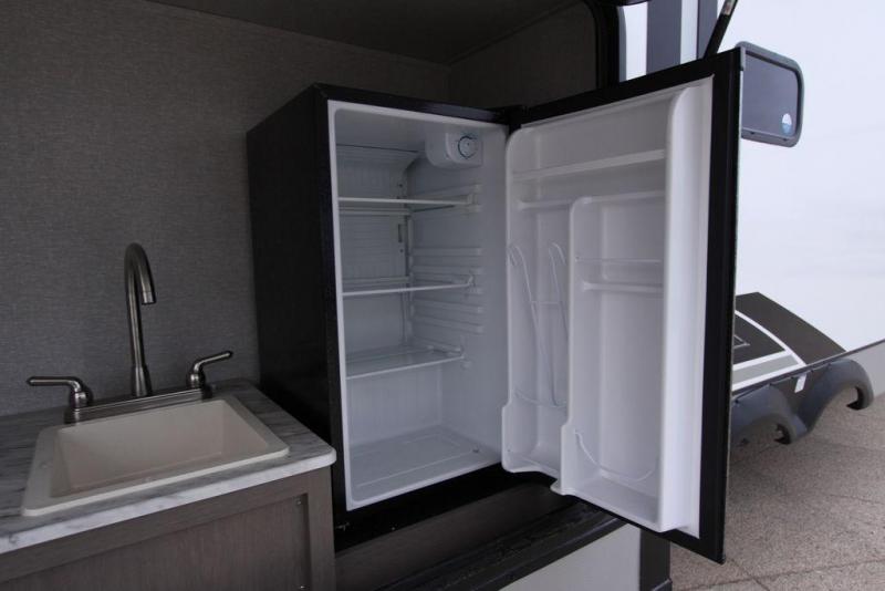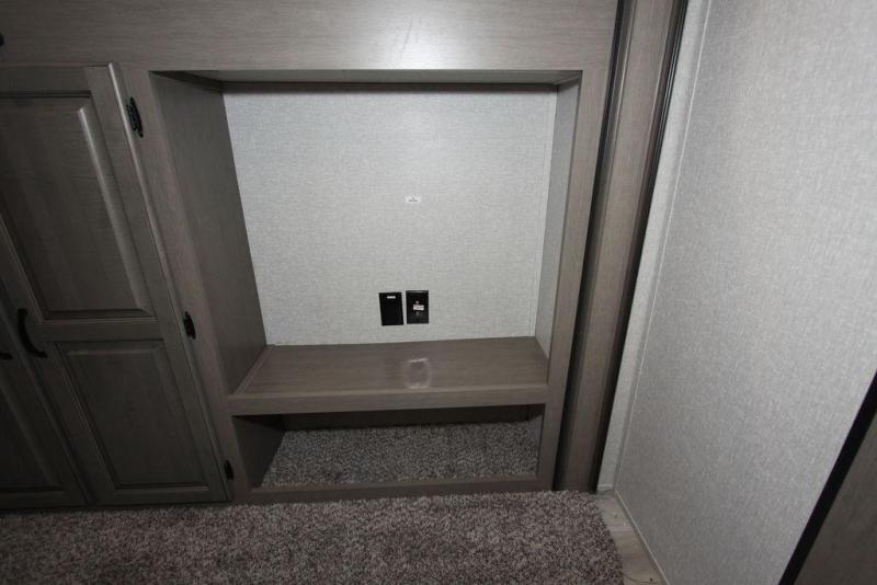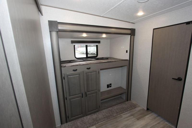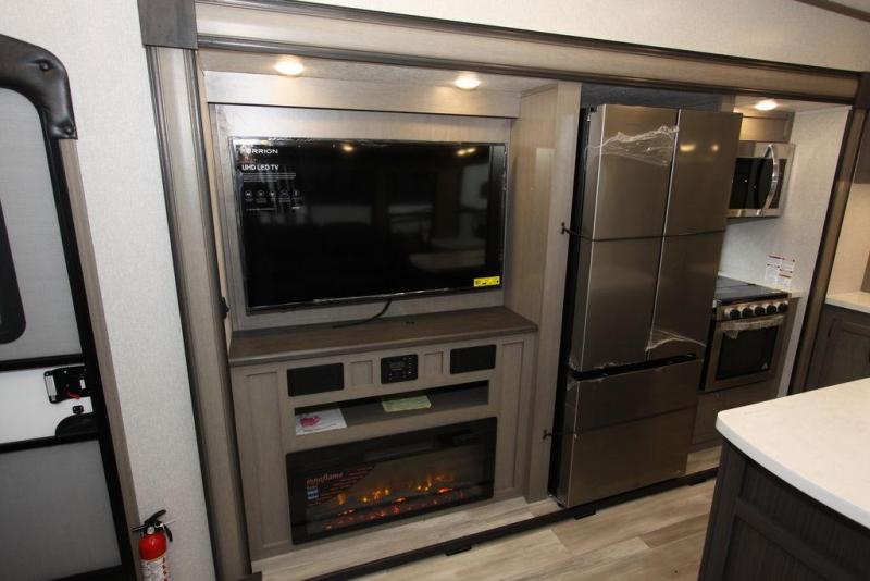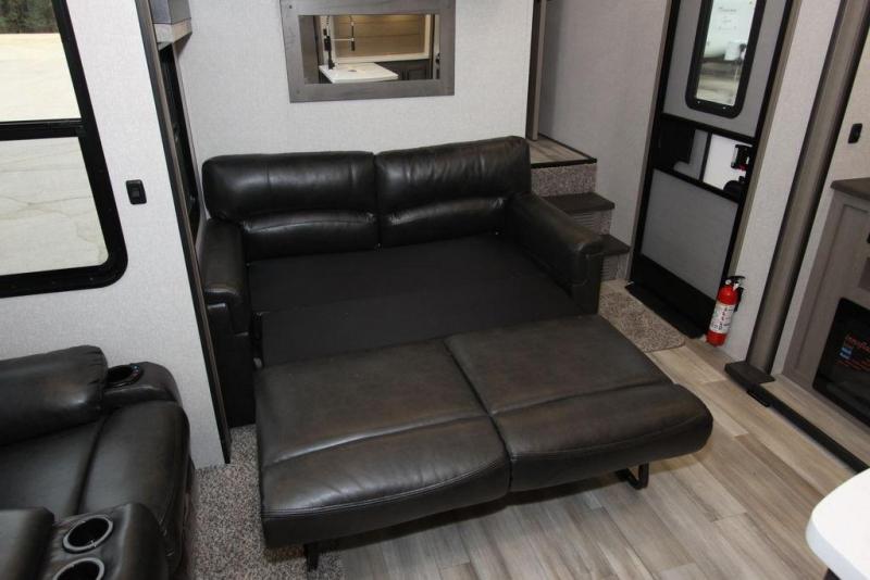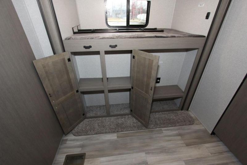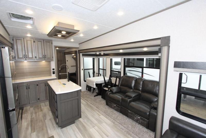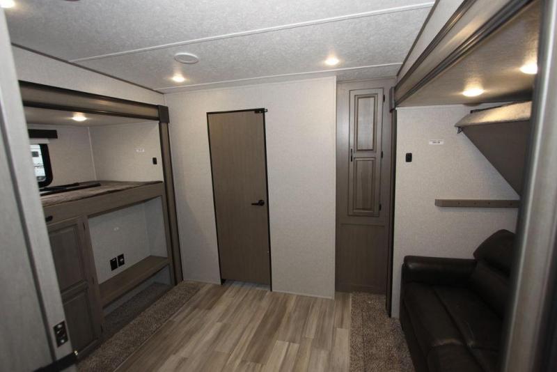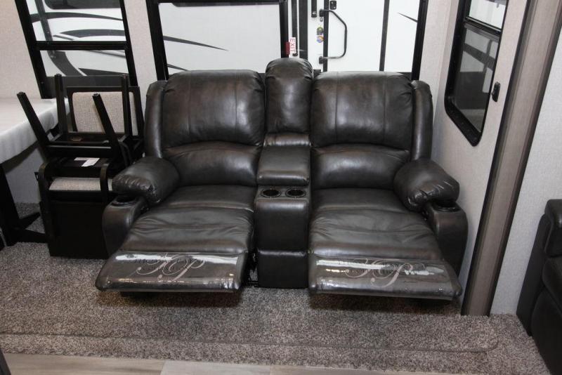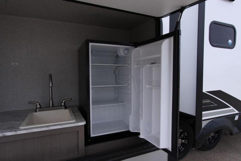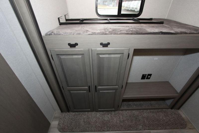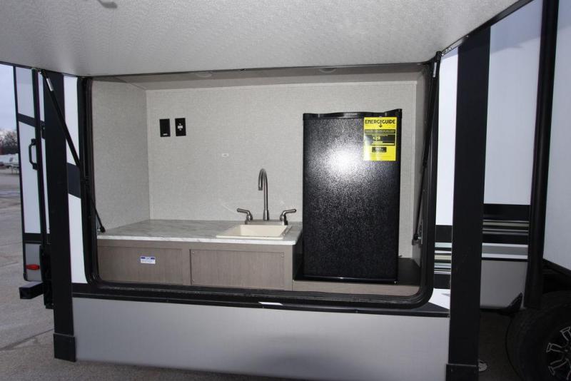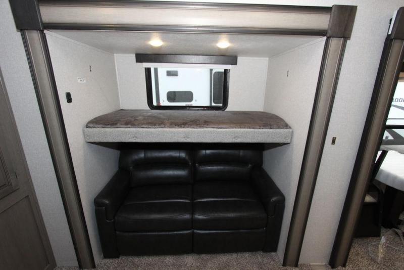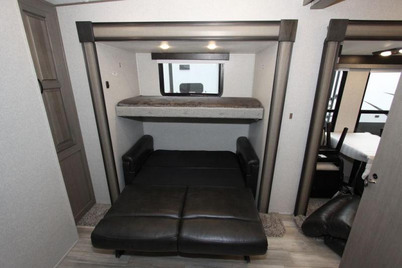 Camping with a large group of friends or family is easier than ever in this roomy fifth wheel for seven to eight. There are two full baths, with your guests having their own bath with its own exterior entry door in in the bunkhouse. How convenient! The chef of your group will find all they need in the interior kitchen, or they can cook outdoor on the outside kitchen. Inside, there is comfortable seating spaces on the sofa, the theatre seating, and the free-standing table, plus you can add the optional 50" LED TV to the entertainment center for even more fun. Having your own bedroom to retreat to each night will be much appreciated. There is a queen bed, a wardrobe slide out, dual nightstands, and even washer and dryer prep!